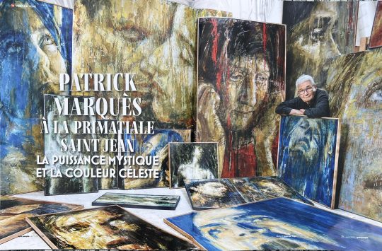« Au Théâtre Le Trianon, où se joue » l’Aiglon », Patrick Marquès expose une quinzaine de ses peintures. Dans un lieu propice à ses grandes toiles, il donne l’occasion au public parisien de le connaitre. Né en 1951, il suit les cours de l’école des beaux arts de Clermont Ferrand, ce qui lui permet d’acquérir une maîtrise des techniques picturales. Dans un premier temps, il réalise de nombreux tableaux de femmes nues, charnelles. Il peint aujourd’hui l’intériorité humaine : S’éloignant du figuratisme statique, il amène ses personnages à d’intenses expressions, emportés par la beauté de la lumière. Ses titres des tableaux évoquent les réflexions du peintre : Aspiration de l’homme à la liberté, l’humain en quête de lumière. Les corps sont bleus ou bruns, froids, mais, cette incandescence jaune et rouge, présente dans chaque peinture, réchauffe l’être et l’œil du visiteur. Par le choix de la couleur, et par une technique étonnante, Patrick Marquès réussit à la perfection à peindre le paradoxe humain, en captant l’obscur et le lumineux de chaque homme, la dureté de la vie terrestre et le mystère de l’haut delà. »
