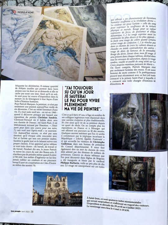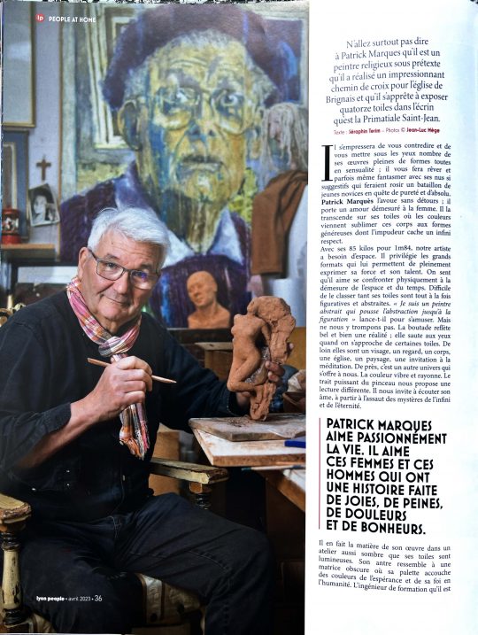 Patrick Marquès analyse son œuvre, aussi bien qu’il la construit depuis ses débuts, et les encouragements de son maître, Christian Sandrin. Ecoutons-le : « La vérité des choses n’est pas leur apparence, mais ce qu’elles révèlent. La beauté n’est pas la forme, mais le rayonnement de la forme… » Le corps féminin est son viatique. Il y a de la ferveur, de l’obsession, de la vigueur, de l’outrance dans la peinture de Patrick Marquès. Tout ce qui manque, désormais aux compositions pitoyables de Patrice Giorda. Toutes ses toiles sont passionnantes, mais une, doit particulièrement retenir votre attention. Il s’agit de l’Angélus. Peut-être, penserez-vous, comme moi, à l’engagement de Vélasquez, du Greco, d’Anselm Kieffer, ou, d’Etienne Sandorfi ? Un événement incontournable. Le président du département, Christophe Guilloteauannonça, pendant un discours très inspiré, que l’an prochain, il prêterait une partie de la collection de cette institution en hommage à la peinture lyonnaise. Belle initiative !…